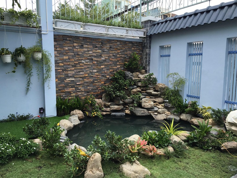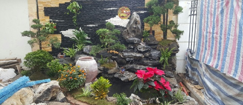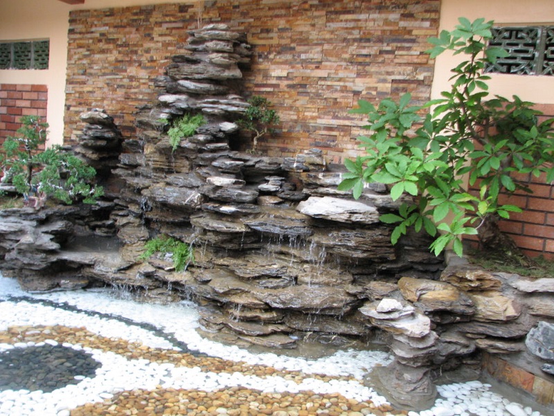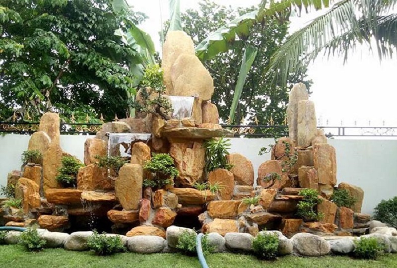 Hòn non bộ thác nước giúp mang thiên nhiên vào không gian sống và tô điểm thêm màu sắc tươi mới cho khu vườn.